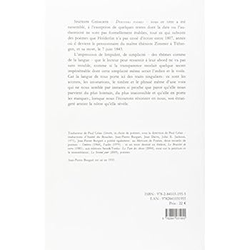 Späteste Gedichte, derniers poèmes, SOUS ce titre a été rassemblé, à l'exception de quelques textes dont la date ou l'authenticité ne sont pas formellement établies, tout ce qui subsiste des poèmes que Hölderlin n'a pas cessé d'écrire entre 1807, année où il devient le pensionnaire du maître ébéniste Zimmer à Tübingen, et sa mort, le 7 juin 1843. L'impression de limpidité, de simplicité, des thèmes comme de la langue, que le lecteur peut ressentir à leur abord ne va pas sans trouble, comme si la transparence recelait quelque secret impénétrable dont cette simplicité même serait l'indice et le voile. Car la langue de tous porte ici des traits singuliers : ce sont les accents, les intonations, le timbre et le phrasé même d'une voix qui ne nous semble par instants si proche que parce qu'elle nous parvient du plus lointain, du plus inaccessible et qu'elle en porte les marques ; lorsque nous l'écoutons résonner en nous, son étrangeté atteint la nôtre qu'elle révèle.